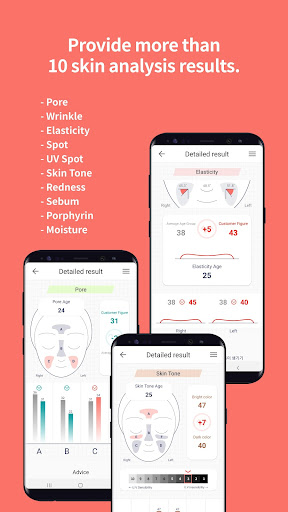 Please check out the condition of the skin including pores, wrinkles, elasticity, nasolabial fold, spots, U.V spots, skin tone, redness, sebum and jawline angle.