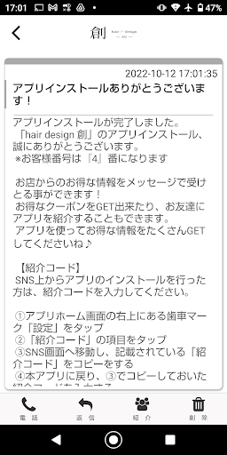hairdesign創のアプリをSNSを通じてお友達に紹介する事ができます。