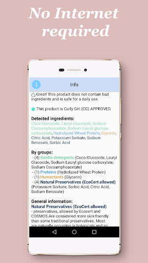 – Using the camera on your phone scans the list of ingredients (not a barcode) of a shampoo, balsam or mask and covers in it the type of detergent (harsh, mild, gentle or very gentle),  presence of silicones, drying alcohol, potential allergens, as well as emollients, proteins and humectants. What exactly it means you can read by clicking “Info” in the app;