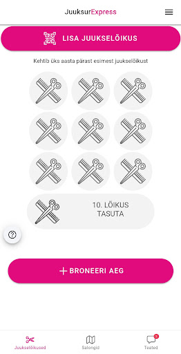 Juuksurexpress virtuaalne kliendikaard. Sellega te saate broneerida aeg juuksurile, kasutada kogutud juustelõikused et saada 10-s tasuta juustelõikust. Samuti selles appis on olemas kõik meie salongide kontaktid