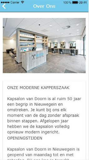 In de app van kapsalon van Doorn kunt u zien wie en wanneer werkzaam is zodat u altijd bij uw favoriete kapper terecht kunt. Maak gebruik van ons handige spaarprogamma in de app voor leuke acties. Neem contact met ons via de app via de contact functie en maak direct een afspraak.