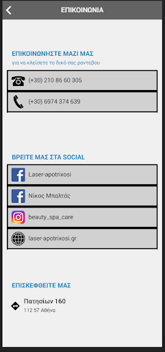 Το εξειδικευμένο προσωπικό του κέντρου αισθητικής Beauty spa – laser apotrixosi, με υπεύθυνο τον πτυχιούχο Αισθητικό Αθηνών Μπαλτά Νίκο,με τον σύγχρονο εξοπλισμό από μηχανήματα νέας τεχνολογίας και επαγγελματικές θεραπείες προσώπου και σώματος, προσφέρουν υπηρεσίες υψηλής αισθητικής σε έναν όμορφο και φιλικό χώρο.