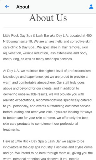 Little Rock Day Spa & Lash Bar aka Day L.A. Located at 400 N Bowman suite 19. We are an aesthetic and corrective skin care clinic & Day Spa . We specialize in hair removal, skin rejuvenation, wrinkle reduction, lash extensions and body contouring, as well as many other spa services. Little Rock Day Spa & Lash Bar aka Day L.A. Located at 400 N Bowman suite 19. We are an aesthetic and corrective skin care clinic & Day Spa . We specialize in hair removal, skin rejuvenation, wrinkle reduction, lash extensions and body contouring, as well as many other spa services. Download now our app for more informations.