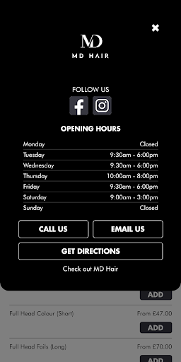 The MD Hair booking app allows clients to log on and make bookings online under their own profile 24/7. Clients can track loyalty points, look at historical and future bookings, and get directions for their favourite salon.