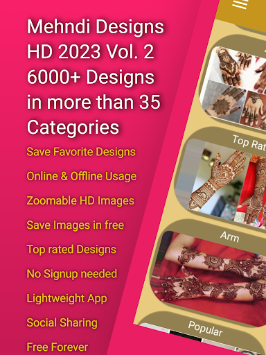 Cette application contient également Mehndi Designs pour le ventre/ventre, la cheville, l’épaule, la jambe et le dos. Les conceptions et les tatouages Mehndi simples sont spécialement conçus pour que les hommes puissent profiter de fêtes avec des conceptions mehndi.