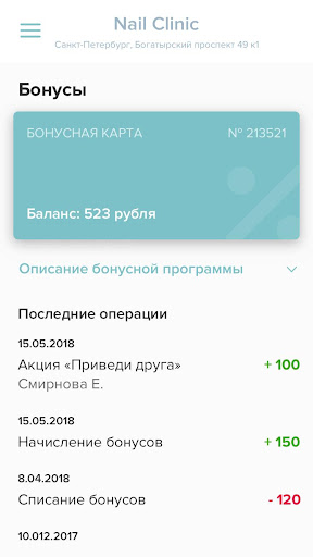 – Бонусы, их количество, и история начисления и списания