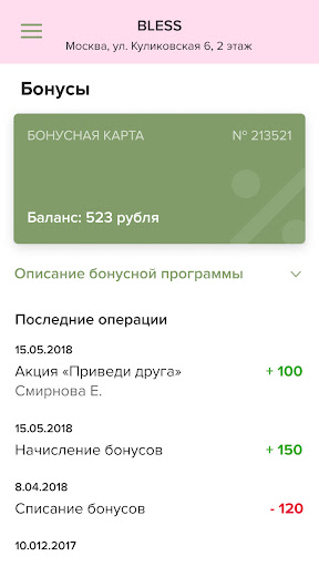 – Бонусы, их количество, и история начисления и списания