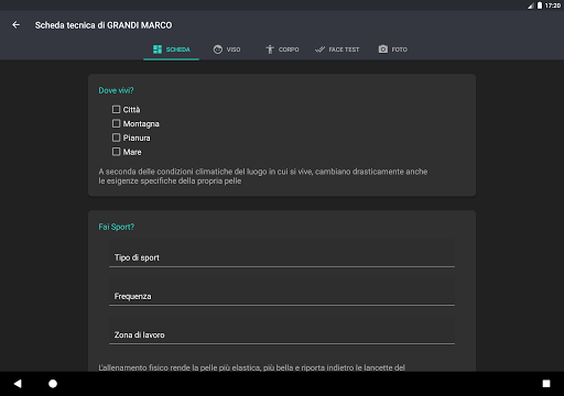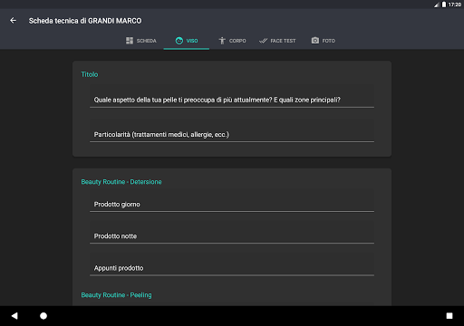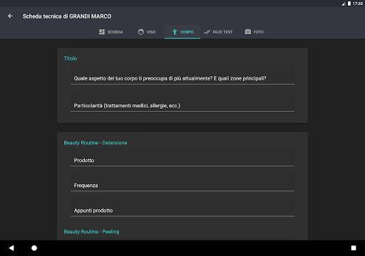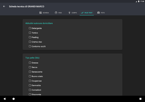 Con la Scheda tecnica Beautech è possibile fare un’indagine al cliente su corpo e viso, registrare in dettaglio le sue abitudini ed i suoi inestetismi. Possiamo registrare i dati anagrafici di un nuovo cliente o modificare quelli di uno già esistente, scattare direttamente foto ed archiviarle nel nostro database.