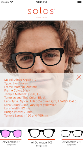 Solos VTO is a free online platform for virtually trying on different styles of eyeglasses owned by Solos Technology Limited, an expertise in innovating smart eyewear. Equipped with front and back cameras, you can choose your own glasses or help your friends to choose one. Show your favorite glasses to your friends to get comments by our “Share It” icon before you determine to buy it. Come to download Solos VTO and have fun.