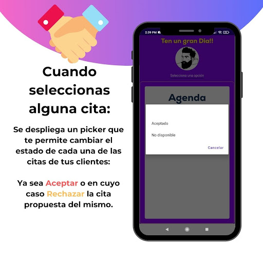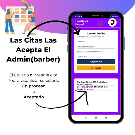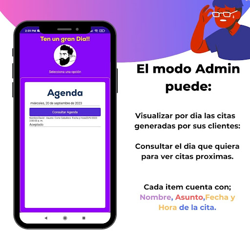Modo Administrador: Nuestro equipo de administradores puede establecer un horario diario y gestionar las citas en una pantalla dedicada. Acepta o rechaza citas de manera eficiente para mantener todo en orden.