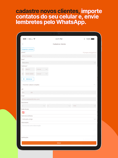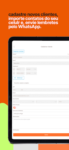 Cadastre ou edite os dados do cliente, envie lembretes via WhatsApp e mensagens de aniversário com apenas um clique.