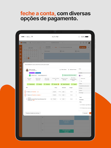 Finalize o atendimento e faça o fechamento de conta com todas as formas de pagamento, opção de adicionar produto, aplicar desconto, editar o preço e o serviço. Tudo fica registrado no sistema.