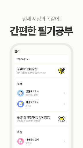 2024년 7월 개정된 운전면허 필기시험 문제은행이 그대로 반영되었어요. 실제 운전면허 필기시험과 동일한 문제 구성과 수를 풀고 싶다면 모의고사를 풀어보세요. 시간이 많이 없다면 10문제의 미니 모의고사로 공부할 수도 있어요.