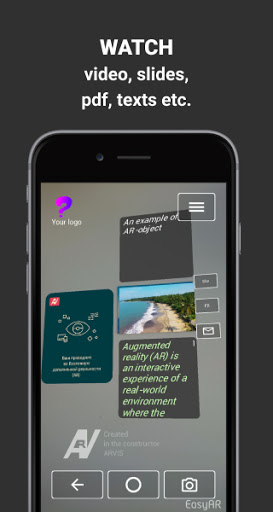 App features: using AR- viewer Arvis you will make your pictures animated by turning them into interactive multimedia content. ARVIS is not just a beautiful augmented reality, but also a whole tool for transmitting and providing information.