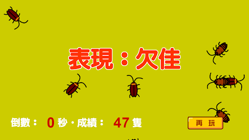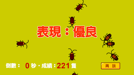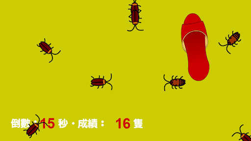遊戲中會有蟑螂從四面八方進入玩家的眼前。玩家只要利用手中的拖鞋將它們一一消滅。遊戲限定時間為30秒。在時間結束後,遊戲將會自動計分,如成績為80隻以下為欠佳,80至120隻為中等,若達120隻以上者,則為優良。加油!大家一起消滅病蟲媒,為居家的好環境共同努力吧!