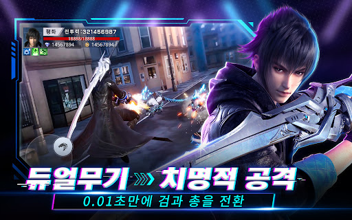 언제 어디서나 무기를 원하시는 대로 근접이나 원거리로 바꿀 수 있으십니다. 손에 ‘한손검’도 들 수 있으시고 ‘쌍권총’도 들 수 있으십니다. 전투에서 다양한 공격 모드를 즐기시고, 역대급 모바일 게임의 차세대 새로운 플레이 방법을 체험하세요.”