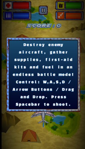Destroy enemy aircraft, gather supplies, first-aid kits and fuel in an endless battle mode! In this game, the degree of difficulty gradually increases.