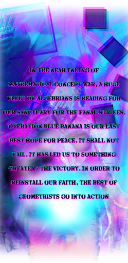 In the near ending of Mathematical Concept War, a huge fleet of Algebrians is heading for our sanctuary for the fanal strikes. Operation Blue Banana is our last best hope for peace. It shall not fail. It has led us to something greater – the victory. In order to reinstall our faith, the best of geometrists go into action.