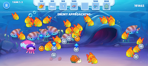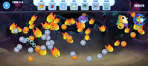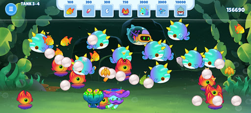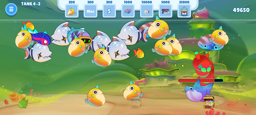 – Adventure: In this mode, at each round the player will be given a few guppies, raised to grow so that they spawn coins or diamonds. To finish a round, we must buy 3 pieces of an egg. The egg will hatch a special creature, which can help the player in later rounds. Players also have to fight monsters to protect the fish by using lasers and shooting them in the head.