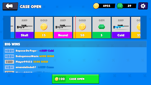 Open case and earn GOLD, GEM and AWP rewards. You only need to spend 100 gold to open the skin case. Try your luck to win free skins!