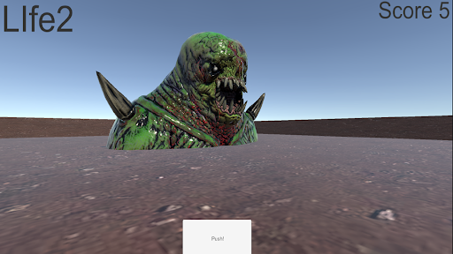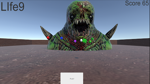 画面右側ををタップした状態で、指を左右にスライドさせることでプレーヤーを動かせ、左側をタップしたままスライドさせると視点を動かせます。ステージには巨大なモンスターがいて、このモンスターにオブジェクトを射出して、当たると右上にあるスコアが増えます。オブジェクトがモンスターに当たらずに地面に落ちると左上のライフが減ります。このライフの数が0になるとゲームオーバーです。ゲームオーバーになるまでにどれだけスコアを高くすることが出来るかを競います。