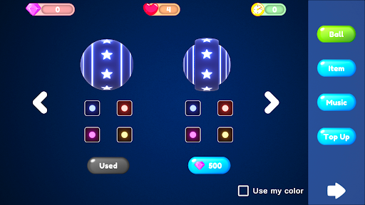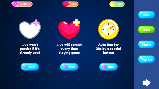 You can change background music or buy support items for your Balls in the shop scene.
