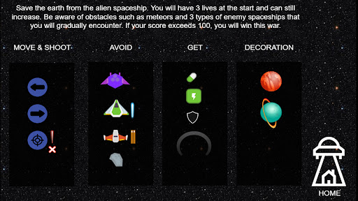 Alien spaceships invaded the earth. You are on a space mission to save the earth from enemy attacks. The war is coming, be prepared!