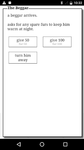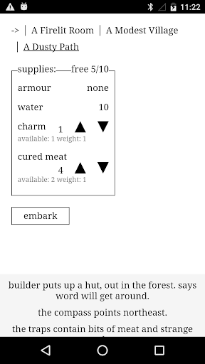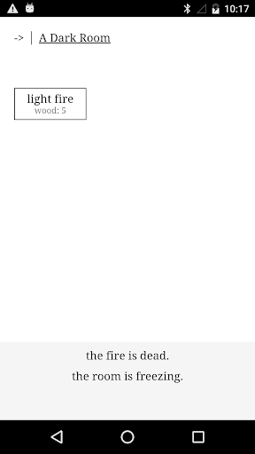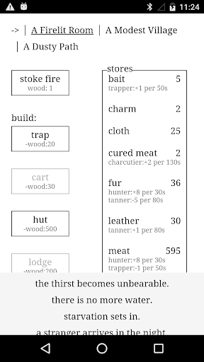 A Dark Night starts with a few lines of text on a dark screen, and what you can do is pressing the “stoke fire” button. When a ragged stranger has come, you keep stoking the fire, the grey progress bar slowly filling itself out again each time to signal when you’ll be able to press the “stoke fire” button again. Then you will find more strangers come, and more resource should be built & managed.