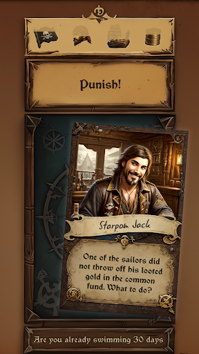 Each card represents a member of a pirate crew with an endless stream of problems in which you will give the final verdict. If you fail to balance the interests of your crew, they will riot and overthrow you.