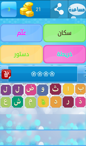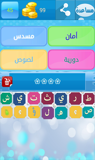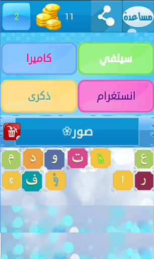 كشف حرف صحيح , حذف أحرف خاطئه , كشف كلمه أخرى أو معلومه , وتخطي للمرحله