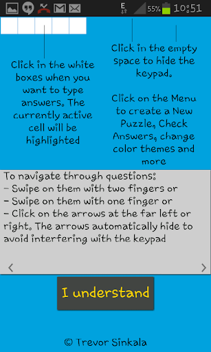 – Tap in the empty space to hide the keypad. Click on the Menu to create a New Puzzle, Check Answers, change color themes and more