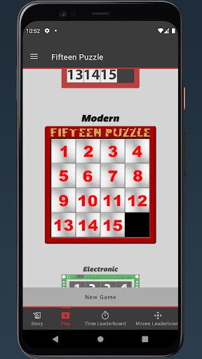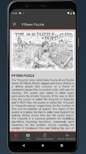 The 15 puzzle (also called Gem Puzzle, Boss Puzzle, Game of Fifteen, Mystic Square and many others) is a sliding puzzle that consists of a frame of numbered square tiles in random order with one tile missing.
