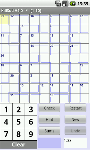 KillSud – Killer Sudoku is a variation of Sudoku, as described at Wikipedia: