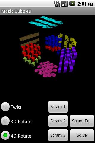 MC4D is a true analog of Rubik’s Cube in four dimensions. Tap a hyper-face (a 3x3x3 block of hyper stickers) to rotate that face to the center. Use the buttons to scramble 1, 2, or 3 random twists and then try to undo those twists back to the solved state. Or hit the “Solve” menu item and watch the app do it.