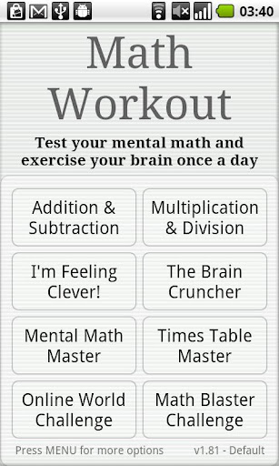 Keep your mind healthy, test your mental math and exercise your brain once a day. Math/Maths Workout is a set of scientifically tested daily brain training exercises and math drills designed to enhance mental arithmetic.