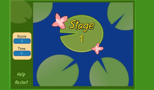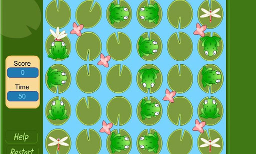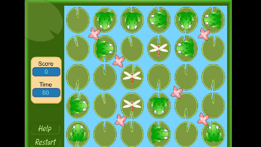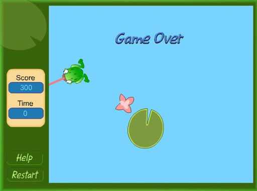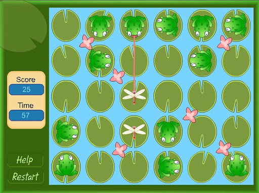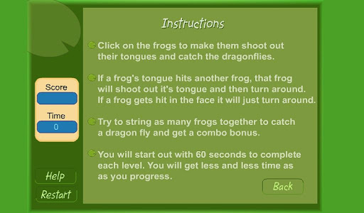 Catch all the dragonflies with the frogs’ tongues. Click on a frog to make him shoot out his tongue. If a tongue hits another frog, that frog will shoot out his tongue and reverse his direction. When a frog gets hit in the face with a tongue he will only reverse his direction. The more frogs you string together to catch a dragon fly, the more points you will score. The game starts out with 60 seconds to complete the level, but decreases as you progress through levels.