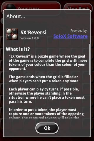 “SX’Reversi” is a Reversi game (also known as Othello) where the goal of the game is to complete the grid with more tokens of your colour than the colour of your opponent.