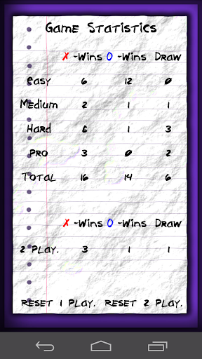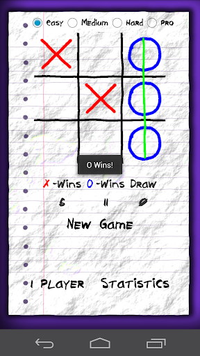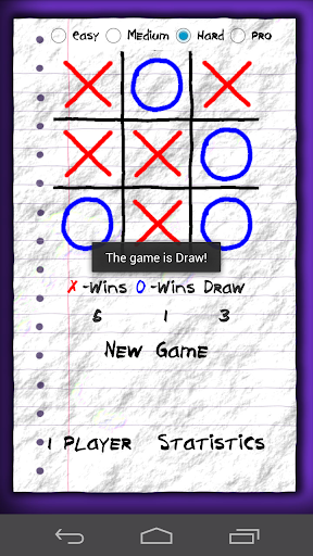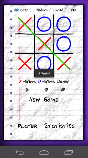Remember the times in school when you playing Tic Tac Toe on sheets of notebook! Now you can play Tic Tac Toe on your Android device for free. Tic Tac Toe supports one player and two player gameplay, so you can play against another human or against your Android device. When you play against Android, you will see amazing artificial intelligence with 4 difficulty levels:
