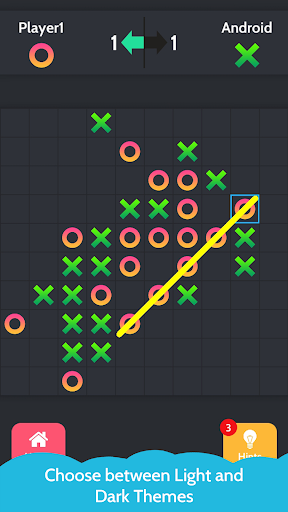 Our game Tic Tac Toe Mega enables you to play the classic tic-tac-toe on your android device in a pleasant new style. Tic Tac Toe Mega comes with more advanced, unique and exciting features that make it the best game for seasoned tic tac toe players. It comes with a beautifully designed 10×10 board that brings more challenge to the game as compared to the 3×3 or 5×5 board. It also contains a list of colorful icons to select from, so instead of playing with only ‘O’ and ‘X’, you can select a colorful icon of your choice. You can choose light or dark themes and enjoy a cool simplistic gameplay. These features make Tic Tac Toe Mega more exciting and unique.