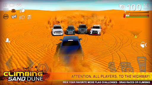 Game Mode – Drag Race is the most popular game mode, very challenging to win the race and there is a daily championship with generous gifts. Free Roaming in a desert gives you the freedom of climbing dunes, hooking some treasure boxes or hooking a friend out of sand or flood. Flag challenge has the most fun gameplay but only opens on special occasions. Climbing races are made for fearless climbers. Can You Dare to Challenge?