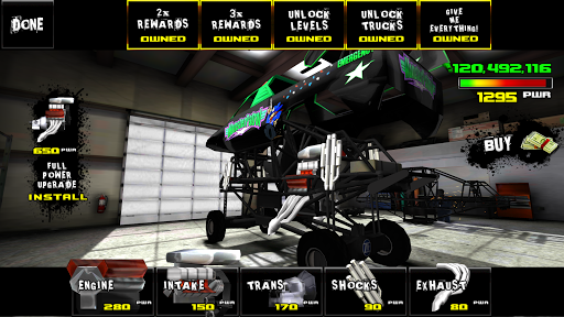 Drive over 60 licensed monster trucks such as BIGFOOT, USA-1, Boogey Van, Outback Thunda, Virginia Beast tanks, Traxxas RC trucks and upgrade your engine exhaust, intake, suspension and transmission to keep up with the competition.