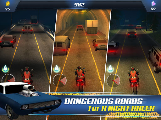 Choose your lucky vehicle and go on the most exciting speed adventure of your life. The first rule of the night race is no rules. Do anything you please as long as you are safe and sound to continue the race. But think twice before taking any chances. Drive fast and try to avoid other vehicles and obstacles appearing on the road. Do not forget to collect diamonds, they bring points and help you upgrade your vehicle.