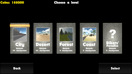 Two Wheel Challenge is a realistic 3D motorcycle racing game. It has four motorbike models and five different driving locations. You start by riding scooter in city. You will earn coins from driving: the better you drive the more coins you get. With coins you can unlock more motorcycles and levels. You can also enhance your bike performance with upgrades.