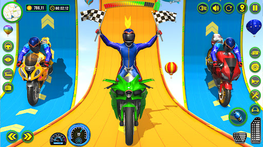 – Multiple mega ramps and large environments in this thrilling moto bike race.