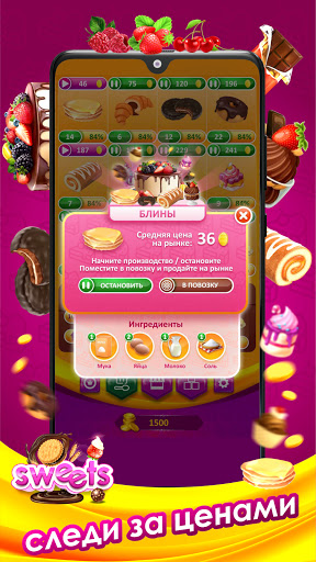Вы кондитер – ваша задача готовить вкусные сладости от блинов и круассанов до мороженых и полноценных тортов. Но для изготовления вам потребуются ингредиенты, которых можно приобрести на рынке. Вы готовите вкусности и отправляете повозкой на рынок продавая их и скупая ингредиенты для новых. Но будьте бдительны и следите за ценами, которые меняются на рынке сырья, вы можете продать выгодно или уйти в минус и стать банкротом. С каждым повышением уровня ваши сладости становятся все дороже а значит и ингредиентов будет все больше. Ваши накопления в виде монет тоже будут падать, так как расходы будут увеличиваться с каждой минутой игры как и в жизни любого предпринимателя приходится оплачивать расходы и издержки чтобы оставаться на плаву. И не забывайте про повозку, её придется ремонтировать и повышать вместимость. Забейте ваш склад товарами необходимыми для готовки. Игра будет вам преподносить викторины в виде вопросов, отвечая на которых вы можете выиграть или же проиграть определенное количество монет. Вы должны будете стать профессионалом своего дела, чтобы заработать свой первый миллион.