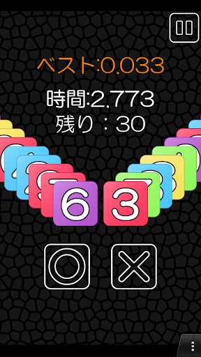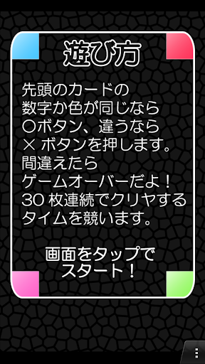 左右のカードの見比べて、色か番号が同じ場合は○、違う場合は×ボタンを押そう。