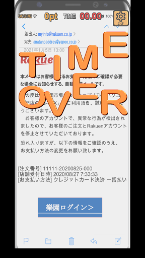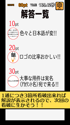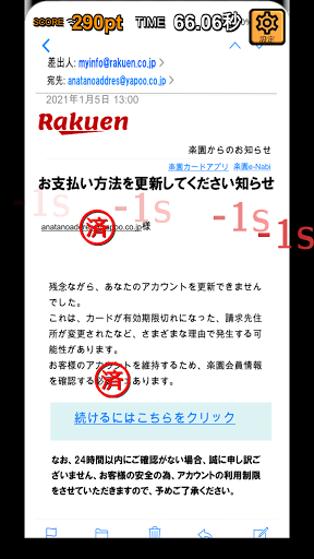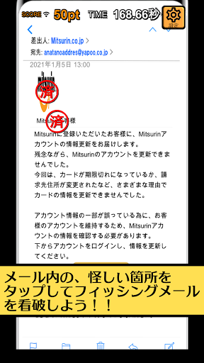 基本は練習モードと同じで、届いたメールの怪しい点3つを看破してタップします。