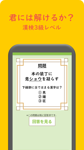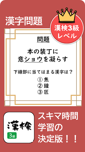 暇つぶしに面白いアプリで合格を目指そう!過去問の3級の暗記を無料でスタートしてトレーニング!オフライン学習による対策で漢字検定の勉強が可能。問題は漢検未経験の小学生レベルから!