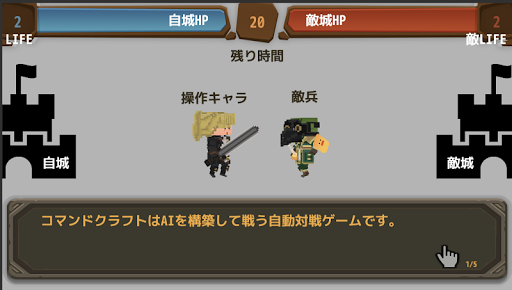 コマンドクラフトは1体のキャラに「攻撃/防御/強化」のコマンドを組み合わせて、相手の城HPを多く削った方が勝利というシンプルなゲームです。