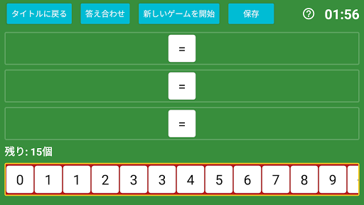 0~9の数字からランダムに選ばれた12個と、+ー×÷の演算子記号からランダムに選ばれた3個が配置されたところからゲームがスタートします。